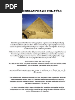 Rahsia Bagaimana Piramid Di Bina Akhirnya Terbongkar. Daripada penjelasan ayat al-Quran di atas jelaslah bahawa selama ini manusia menjadi hairan dan kagum bagaimanakah bangunan-bangunan yang dibina oleh Firaun iaitu piramid dapat berdiri megah dan perkasa di bumi Mesir pada zaman pemerintahannya hingga kini. FIRMAN Allah SWT yang bermaksud.