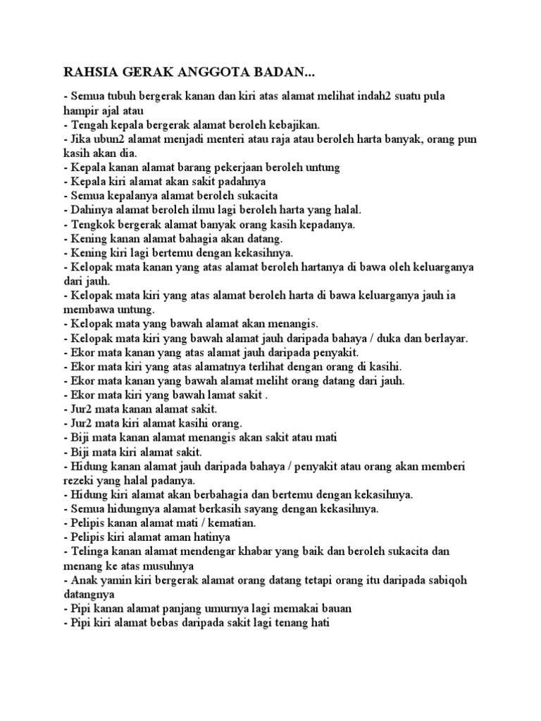 Kepala Jika kulit kepala bergerak-gerak alamatnya anda akan mendapat pekerjaan dan sesuatu yang boleh membanggakan keluarga. Tengah kepala bergerak alamat beroleh kebajikan. Sekiranya tidak mampu duduk di bolehkan.